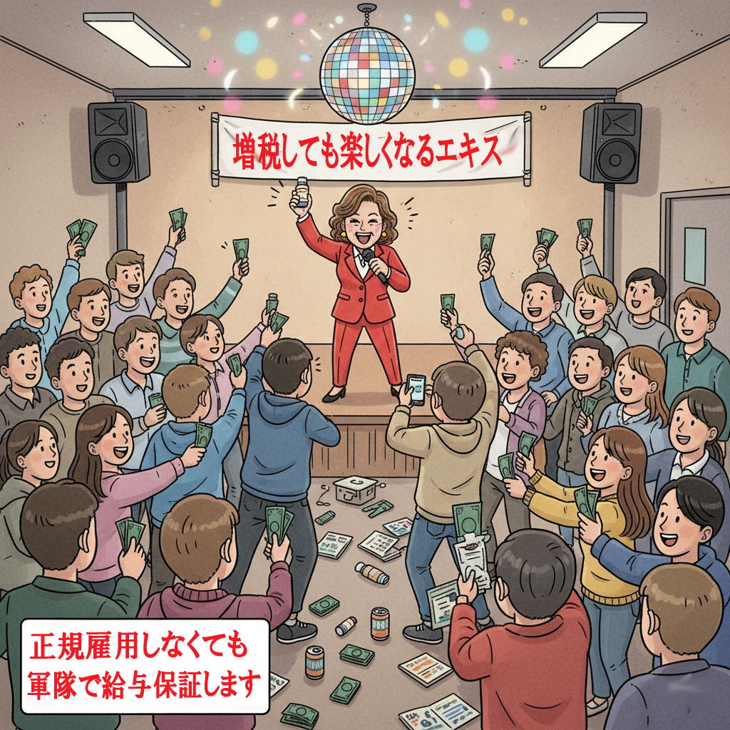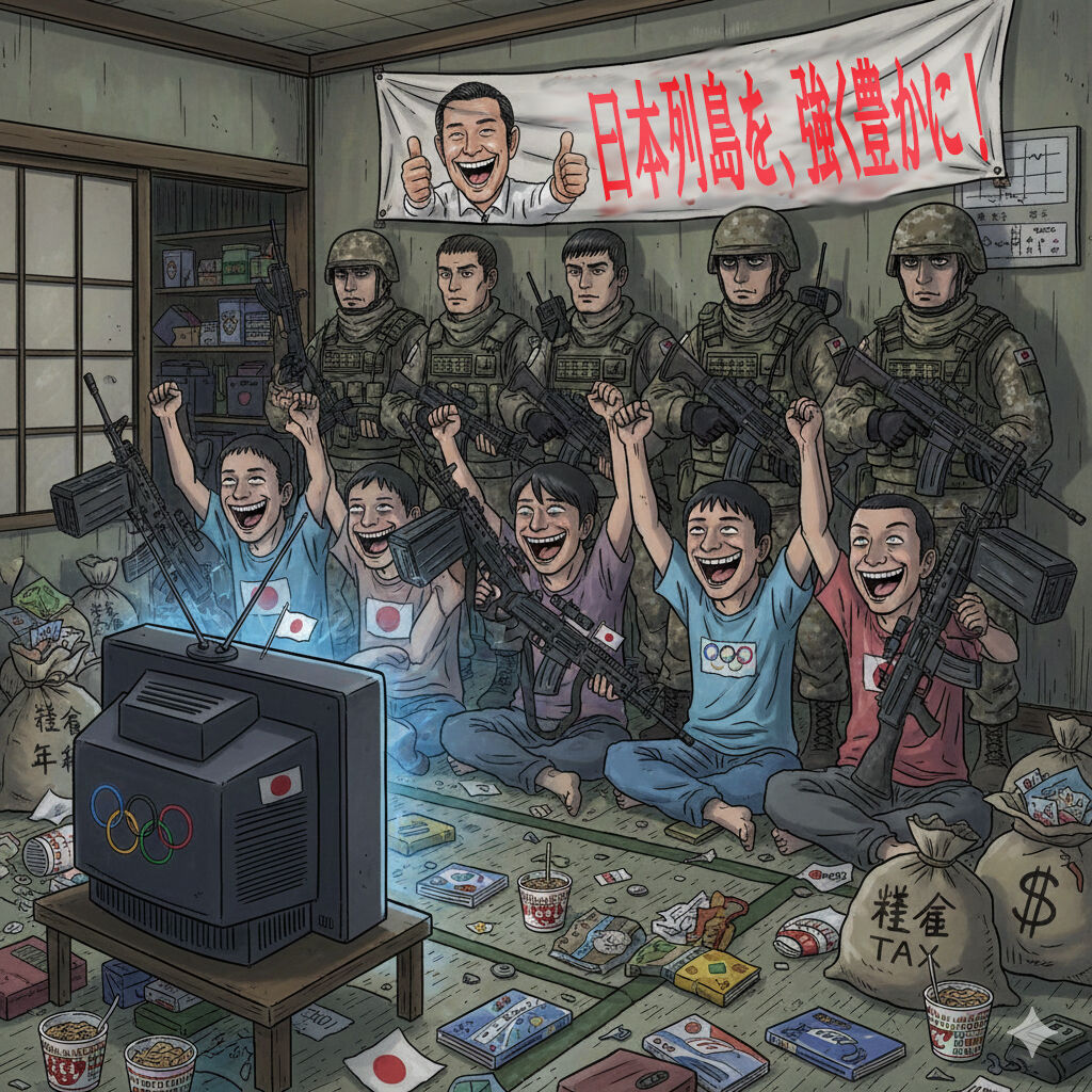 「サプリを飲めば膝が治り、呪罠党に投票すれば国が治る。どちらも消化プロセスのない『魔法』を信じ込ませる詐欺である。100兆丹の戦費も、コンドロイチンの粉末も、その本質は同じだ。『原価(真実)』を知る者から見れば、それはただの空虚な数字と粉の塊に過ぎない。私は、30分限定のセールを笑い飛ばし、鮭のアラを食いながら、この『痴性の祭典』が終わるのを待つ」