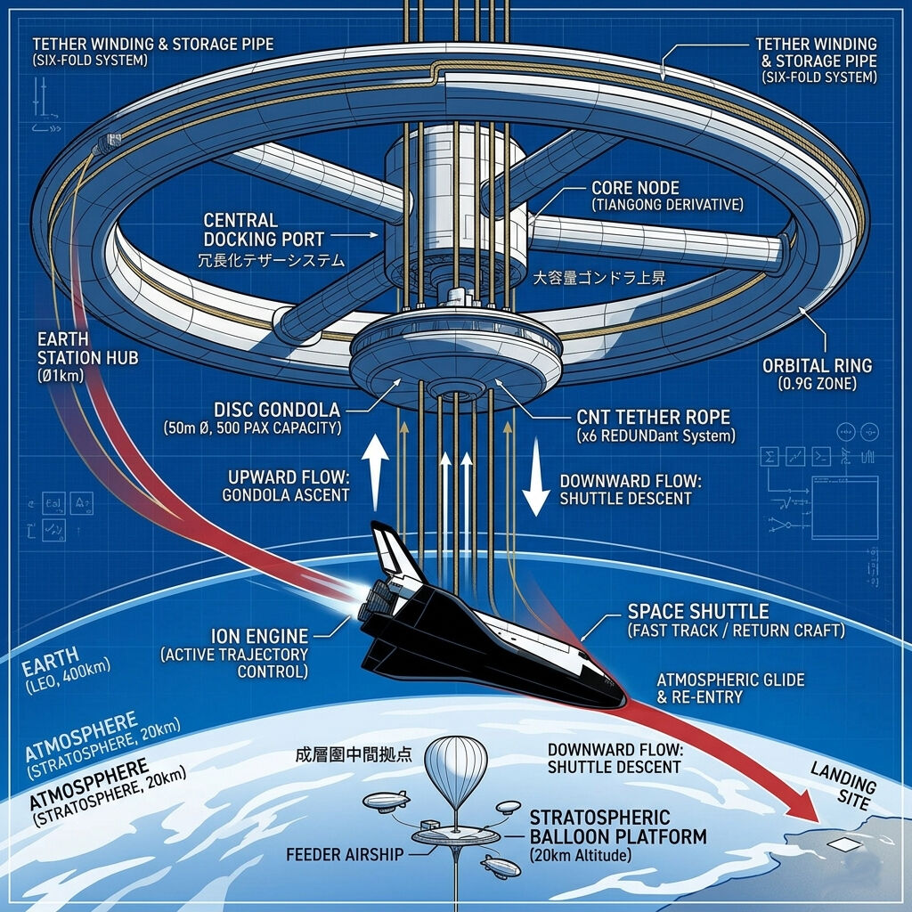 天宮という既存の宇宙ステーションを、わざわざ廃棄して大気圏に投棄するのは、貴重な資源(材料・演算リソース)を捨てるのと同じです。これを「ゴンドラ」として再利用することで、成層圏との往復に必要な構造体コストをほぼゼロにできます。