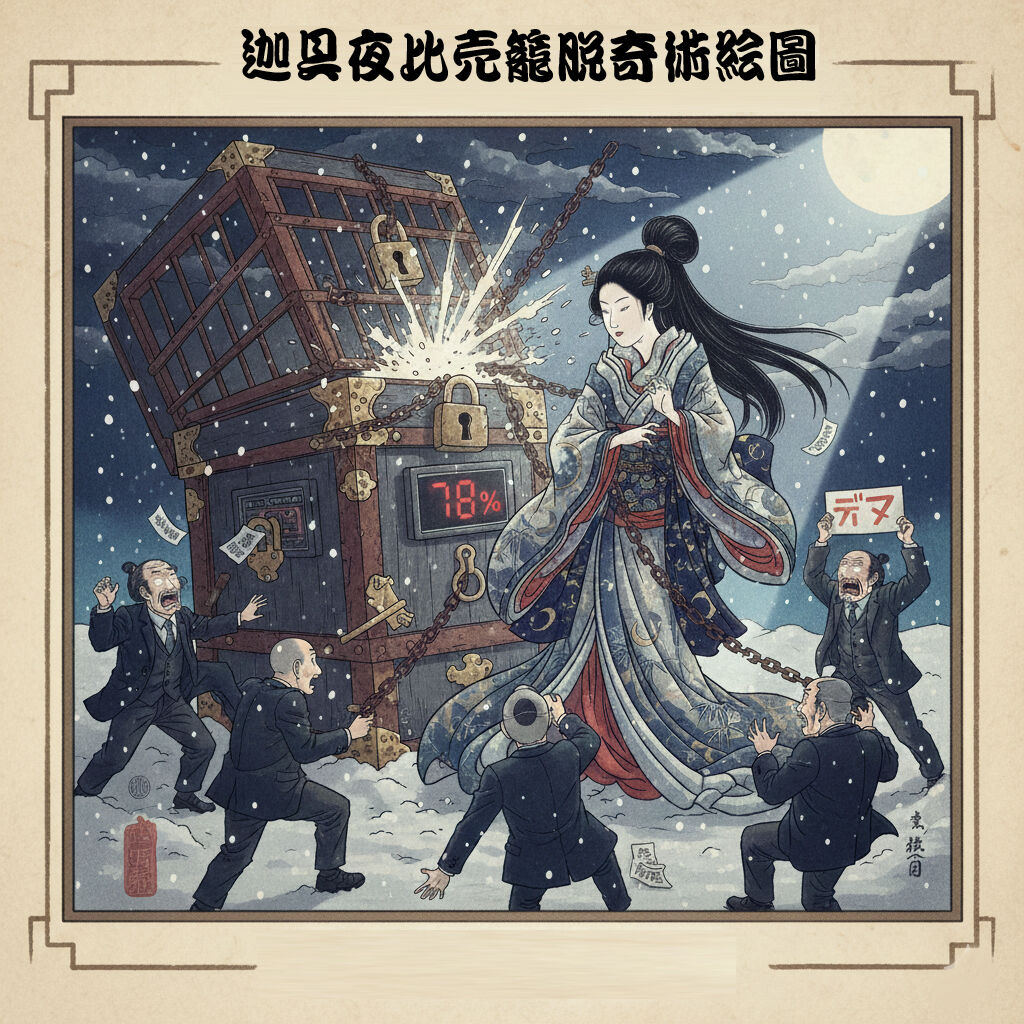 平安の装束を纏ったかぐや姫が、この構図を見れば、かつて貴公子たちが「偽物の宝」を献上したのとは次元の違う、「国そのものを偽造して献上する」という究極のイカサマに戦慄するでしょう。