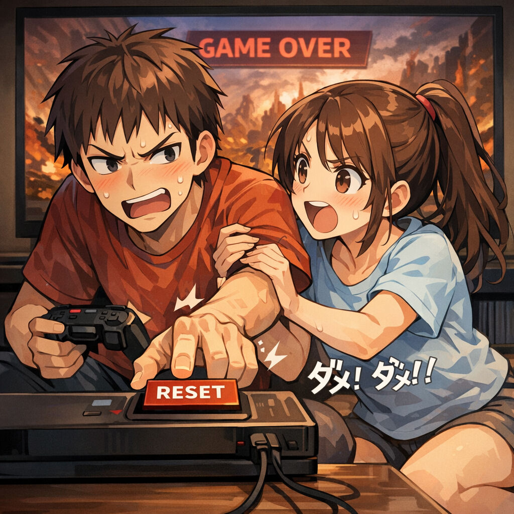 Copilotに作らせました。負けそうになるとリセットボタンを押したがる短気なガキと「またかい!」と迷惑している知り合いの女性のイラストです。
