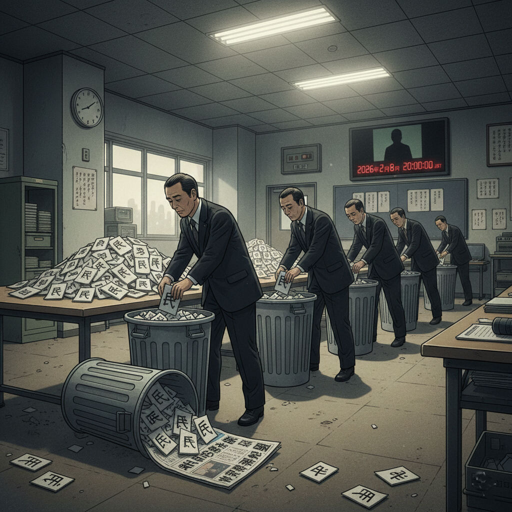 そこには、確かに「民」と書かれた200万の魂(票)が、100万ずつの束に分けられ、半分は「書き間違い」として公式記録に残り、半分は「最初からなかったこと(不自然な低投票率の隠蔽)」として消えていく……。