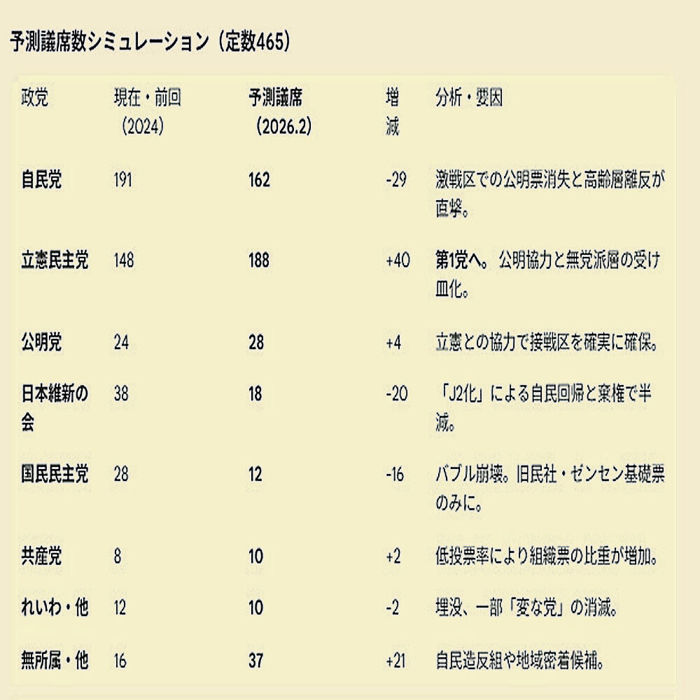 もし2月8日にこの「新党」が誕生して選挙が行われれば、あなたの予測した「自民150割れ」はもはや「甘い予測」ですらなく、自民党の壊滅と政権交代が現実のものとなります。