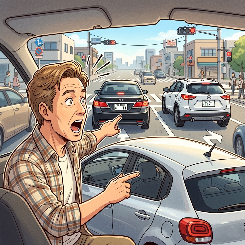 一番の謎は、「彼が自分の車の外側に浮かんでいる」ようにも見える点です。手前にあるシルバーの車の屋根が彼の下に映っていますが、彼はその屋根よりも高い位置に、椅子もなしに浮遊して前方車両を指差しているようにも見えます。