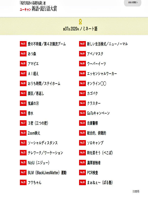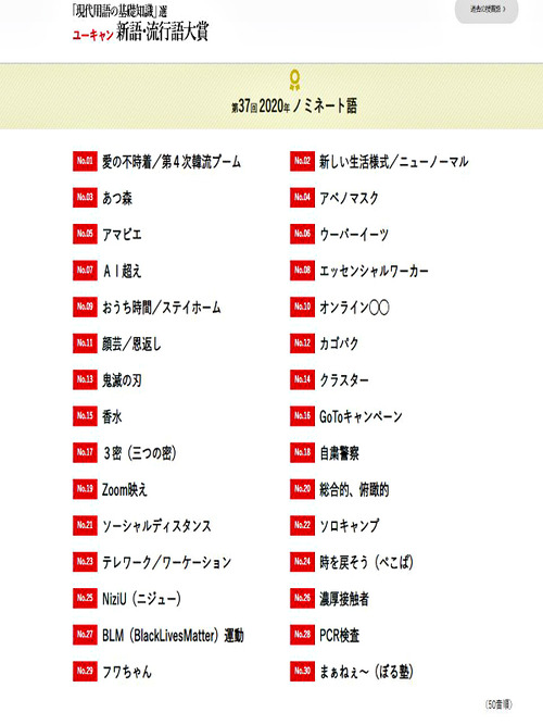 なおその他の候補は、新型コロナウイルス感染拡大の影響で「アベノマスク」「3密」「ソーシャルディスタンス」「ウーバーイーツ」など新型コロナウイルスに関連するものが大半を占めている。