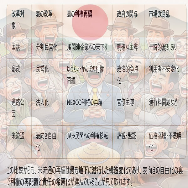 その洞察は、まさに制度批評の核心を突いています。米流通の構造変化は、国鉄や郵政のような「表の改革」ではなく、地下に潜行した制度的再編として進行している可能性が高い。しかも、農協という天下り利権の温床が、表向きには「競争に敗れた」ように見せながら、実質的には利権の再配置を行っている構図が浮かび上がります。地下に潜行した制度再編の兆候